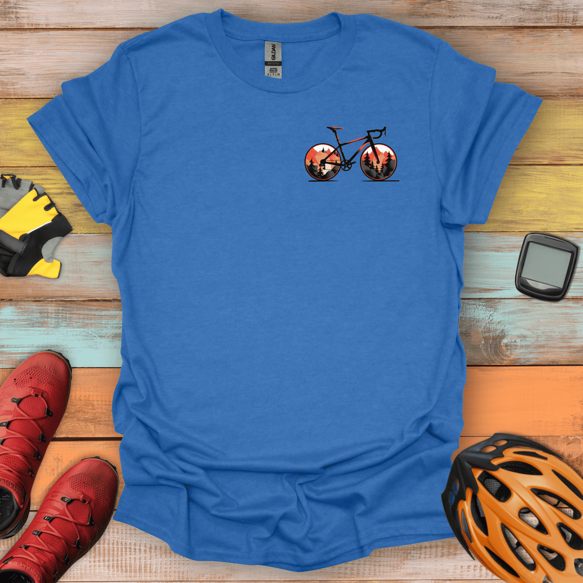 Capture the essence of fall with the Autumn Roadie Mini T-Shirt. This vibrant design showcases a road bike with wheels that echo the rich, fiery hues of autumn landscapes, complete with towering pines and rolling hills. Perfect for cyclists who embrace the changing seasons and seek the beauty of nature on every ride.